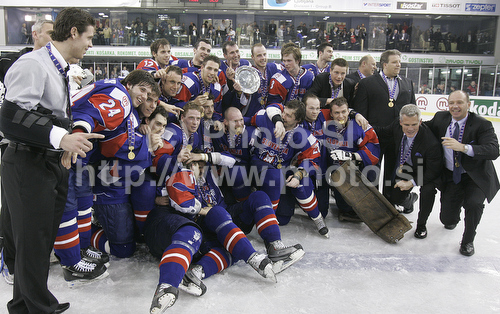 : Players of Slovenia celebrate their victory after ice hockey match of IIHF Ice hockey World championships Division I, group B between Slovenia and Hungary. Match between Slovenia and Hungary of IIHF Ice hockey World championships Division I, group B was held on Friday, 23rd of April 2010 in Ljubljana, Slovenia.