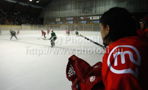Bled ,Slovenia - 20.08.2010 : Suomalainen Jaakko (no.1) of HK Jesenice observig his teammates during ice hockey match Summer League Rudi Hiti (Poletna liga Rudi Hiti) 2010 between HDD Tilia Olimpija and HK Acroni Jesenice. Match between HDD Tilia Olimpija and HK Acroni Jesenice was held on Friday, 20th of August 2010 in Ljubljana, Slovenia. Photo by: Primoz Jeroncic