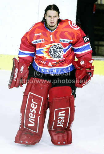 : Suomalainen Jaakko (no.1) of HK Jesenice before ice hockey match Summer League Rudi Hiti (Poletna liga Rudi Hiti) 2010 between HDD Tilia Olimpija and HK Acroni Jesenice. Match between HDD Tilia Olimpija and HK Acroni Jesenice was held on Friday, 20th of August 2010 in Ljubljana, Slovenia.