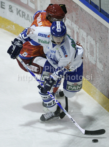 : Andy Sertich of KHL Medvescak (front) and Toni Dahlman of HK Acroni Jesenice (back) during match of EBEL Ice hockey league between HK Acroni Jesenice, Slovenia, and KHL Medvescak Zagreb, Croatia. HK Acroni Jesenice and KHL Medvescak Zagreb was played in Podmezakla hall in Jesenice, Slovenia, on Thursday, 30th of December 2010.