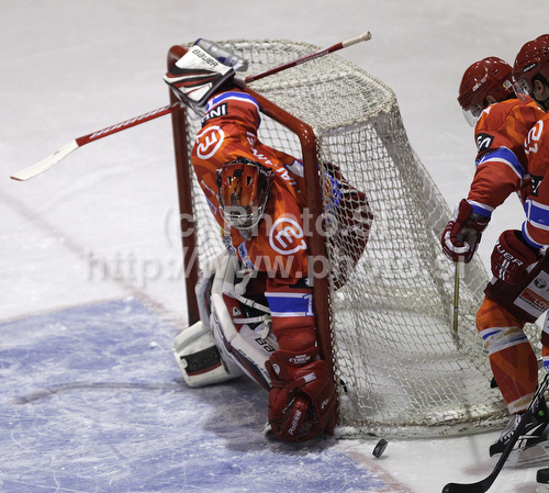Jesenice ,Slovenia - 30.12.2010 : Goalie Jaakko Suomalainen of HK Acroni Jesenice in action during match of EBEL Ice hockey league between HK Acroni Jesenice, Slovenia, and KHL Medvescak Zagreb, Croatia. HK Acroni Jesenice and KHL Medvescak Zagreb was played in Podmezakla hall in Jesenice, Slovenia, on Thursday, 30th of December 2010. Photo by: Primoz Jeroncic