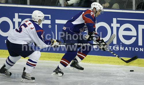 : Tomaz Razingar (no.9) of Slovenia (R) and Woo Jae Kim (no.5) of Korea (L) during ice hockey match of IIHF Ice hockey World championships Division I, group B between Slovenia and Korea. Match between Slovenia and Korea of IIHF Ice hockey World championships Division I, group B was held on Wednesday, 21st of April 2010 in Ljubljana, Slovenia.