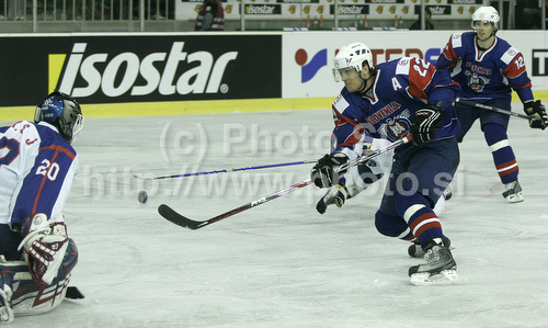: Marcel Rodman (no.22) of Slovenia shooting on goal during ice hockey match of IIHF Ice hockey World championships Division I, group B between Slovenia and Korea. Match between Slovenia and Korea of IIHF Ice hockey World championships Division I, group B was held on Wednesday, 21st of April 2010 in Ljubljana, Slovenia.