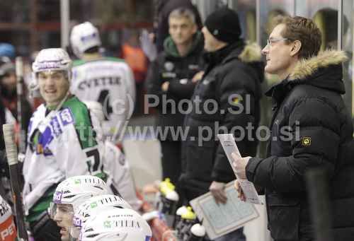 : Coach of HDD Tilia Olimpija Hannu Jaervenpaeae (R) during match of EBEL Ice hockey league between HK Acroni Jesenice, Slovenia, and HDD Tilia Olimpija, Ljubljana, Slovenia. Match between HK Acroni Jesenice and Tilia Olimpija was played in Podmezakla hall in Jesenice, Slovenia, on Saturday, 1st of January 2011.