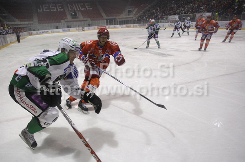 : Tomi Mustonen of HDD Tilia Olimpija (L) and Miha Brus HK Acroni Jesenice (R) during match of EBEL Ice hockey league between HK Acroni Jesenice, Slovenia, and HDD Tilia Olimpija, Ljubljana, Slovenia. Match between HK Acroni Jesenice and Tilia Olimpija was played in Podmezakla hall in Jesenice, Slovenia, on Saturday, 1st of January 2011.