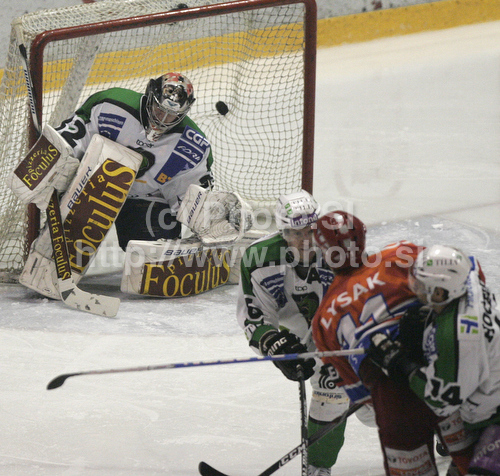 : Goalkeeper Jan Chabera of HDD Tilia Olimpija, Bostjan Groznik of HDD Tilia Olimpija, Brett Lysak HK Acroni Jesenice and Matej Hocevar of HDD Tilia Olimpija (R) during match of EBEL Ice hockey league between HK Acroni Jesenice, Slovenia, and HDD Tilia Olimpija, Ljubljana, Slovenia. Match between HK Acroni Jesenice and Tilia Olimpija was played in Podmezakla hall in Jesenice, Slovenia, on Saturday, 1st of January 2011.
