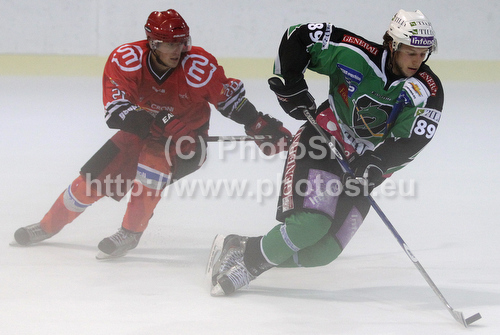 : Sergej Smirkov of Tilia Olimpija (R) and Jaka Ankerst of Acroni Jesenice (L) during ice hockey match Summer League Rudi Hiti (Poletna liga Rudi Hiti) 2011 between HDD Tilia Olimpija and HK Acroni Jesenice. Match between HDD Tilia Olimpija and HK Acroni Jesenice was held on Friday, 19th of August 2011 in Bled, Slovenia.