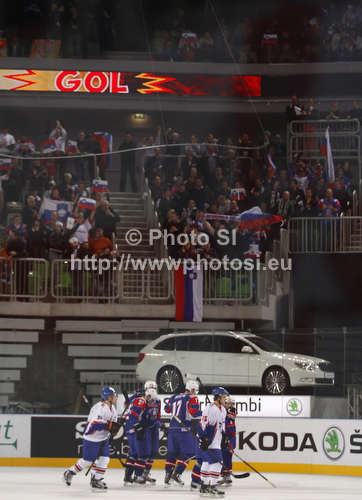: Players of Slovenia celebrating their goal during match of IIHF Ice hockey World championship Division 1 Group A between Slovenia and Great Britain. Match between Slovenia and Great Britain of IIHF Ice hockey World championship Division 1 Group A was held in Stozice Arena in Ljubljana, Slovenia, on Sunday, 15th of April 2012.