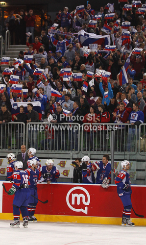 : Players of Slovenia celebrating their goal during match of IIHF Ice hockey World championship Division 1 Group A between Slovenia and Great Britain. Match between Slovenia and Great Britain of IIHF Ice hockey World championship Division 1 Group A was held in Stozice Arena in Ljubljana, Slovenia, on Sunday, 15th of April 2012.