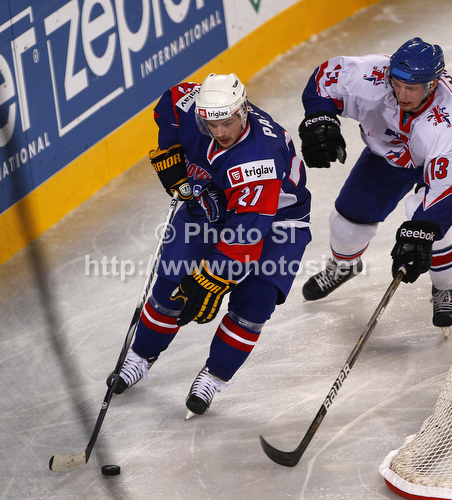 : Rok Pajic (no.27) of Slovenia (L) and David Phillips (no.13) of Great Britain (R) during match of IIHF Ice hockey World championship Division 1 Group A between Slovenia and Great Britain. Match between Slovenia and Great Britain of IIHF Ice hockey World championship Division 1 Group A was held in Stozice Arena in Ljubljana, Slovenia, on Sunday, 15th of April 2012.