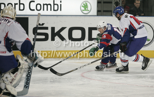 Ljubljana ,Slovenia - 15.04.2012 : Ales Music (no.16) of Slovenia (L) and Robert Farmer (no.10) of Great Britain (R) during match of IIHF Ice hockey World championship Division 1 Group A between Slovenia and Great Britain. Match between Slovenia and Great Britain of IIHF Ice hockey World championship Division 1 Group A was held in Stozice Arena in Ljubljana, Slovenia, on Sunday, 15th of April 2012. Photo by: Leena Jeroncic