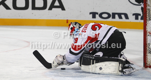 Ljubljana ,Slovenia - 16.04.2012 : Goalie Bernhard Starkbaum (no.29) of Austria (R) in action during match of IIHF Ice hockey World championship Division 1 Group A between Austria and Great Britain. Match between Austria and Great Britain of IIHF Ice hockey World championship Division 1 Group A was held in Stozice Arena in Ljubljana, Slovenia, on Monday, 16th of April 2012. Photo by: Primoz Jeroncic