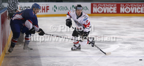 : Michael Grabner (no.17) of Austria (R) and Craig Peacock (no.6) of Great Britain (L) during match of IIHF Ice hockey World championship Division 1 Group A between Austria and Great Britain. Match between Austria and Great Britain of IIHF Ice hockey World championship Division 1 Group A was held in Stozice Arena in Ljubljana, Slovenia, on Monday, 16th of April 2012.