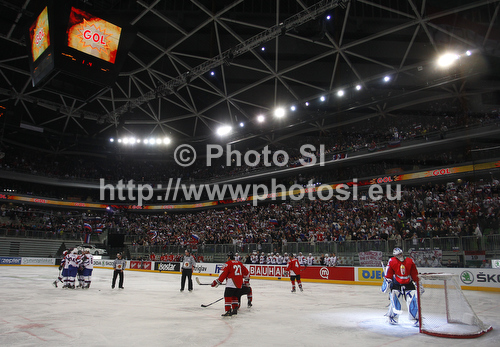 : Slovenian players celebrating their goal during match of IIHF Ice hockey World championship Division 1 Group A between Slovenia and Hungary. Match between Slovenia and Hungary of IIHF Ice hockey World championship Division 1 Group A was held in Stozice Arena in Ljubljana, Slovenia, on Wednesday, 18th of April 2012.