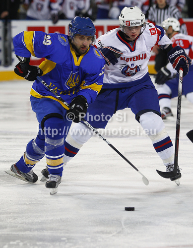 : Ziga Jeglic (no.8) of Slovenia (R) and Vitaliy Liutkevyich (no.28) of Ukraine (L) during match of IIHF Ice hockey World championship Division 1 Group A between Slovenia and Ukrain. Match between Slovenia and Ukrain of IIHF Ice hockey World championship Division 1 Group A was held in Stozice Arena in Ljubljana, Slovenia, on Thursday, 19th of April 2012.