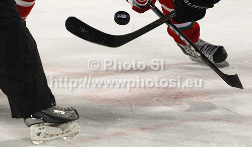 Ljubljana ,Slovenia - 21.04.2012 : Puck drop during match of IIHF Ice hockey World championship Division 1 Group A between Great Britain and Hungary. Match between Great Britain and Hungary of IIHF Ice hockey World championship Division 1 Group A was held in Stozice Arena in Ljubljana, Slovenia, on Saturday, 21st of April 2012. Photo by: Primoz Jeroncic