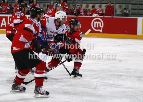 : Tomaz Razingar (no.9) of Slovenia (M) between Mario Altmann (no.2) of Austria (L) and Johannes Kirisits (no.13) of Austria (R) during match of IIHF Ice hockey World championship Division 1 Group A between Slovenia and Austria. Match between Slovenia and Austria of IIHF Ice hockey World championship Division 1 Group A was held in Stozice Arena in Ljubljana, Slovenia, on Saturday, 21st of April 2012.