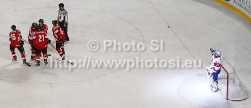 Ljubljana ,Slovenia - 21.04.2012 : Players of Austria celebrate their goal during match of IIHF Ice hockey World championship Division 1 Group A between Slovenia and Austria. Match between Slovenia and Austria of IIHF Ice hockey World championship Division 1 Group A was held in Stozice Arena in Ljubljana, Slovenia, on Saturday, 21st of April 2012. Photo by: Primoz Jeroncic