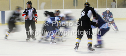 : Players of Stavanger Oilers and VSV Villach in bully during match of Rudi Hiti Ice hockey Summer league 2012 between Stavanger Oilers, Norway, and VSV Villach, Austria. Match between Stavanger Oilers and VSV Villach was held in Bled Ice Arena in Bled, Slovenia, on Friday, 17th of August 2012.
