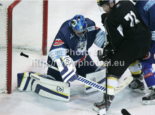 : Thomas Hoeneckl of VSV Villach (31) and Peter Lorentzen of Stavanger Oilers (71) during match of Rudi Hiti Ice hockey Summer league 2012 between Stavanger Oilers, Norway, and VSV Villach, Austria. Match between Stavanger Oilers and VSV Villach was held in Bled Ice Arena in Bled, Slovenia, on Friday, 17th of August 2012.