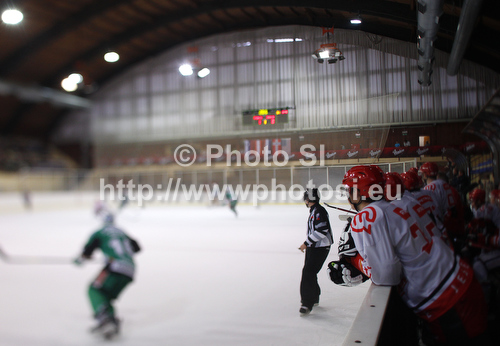 : Players of HK Acroni Jesenice observing play during match of Rudi Hiti Ice hockey Summer league 2012 between HK Acroni Jesenice and HDD Telemach Olimpija. Match between HK Acroni Jesenice and HDD Telemach Olimpija was held in Bled Ice Arena in Bled, Slovenia, on Friday, 17th of August 2012.