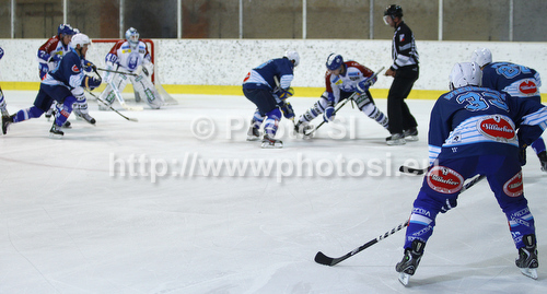 Bled ,Slovenia - 18.08.2012 : Andreas Wiedergut of VSV Villach (R) observing players in bully trying to win puck during match of Rudi Hiti Ice hockey Summer league 2012 between VSV Villach and KHL Medvescak Zagreb. Match between VSV Villach and KHL Medvescak Zagreb was held in Bled Ice Arena in Bled, Slovenia, on Saturday, 18th of August 2012. Photo by: Primoz Jeroncic