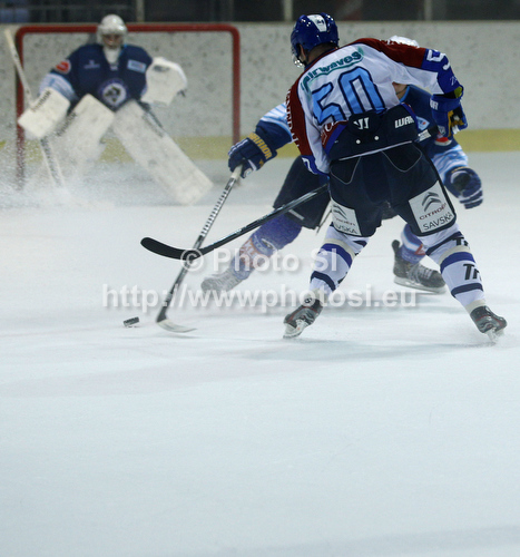 : Andrej Hebar of KHL Medvescak shooting on goal during match of Rudi Hiti Ice hockey Summer league 2012 between VSV Villach and KHL Medvescak Zagreb. Match between VSV Villach and KHL Medvescak Zagreb was held in Bled Ice Arena in Bled, Slovenia, on Saturday, 18th of August 2012.