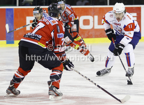 : Anze Kopitar (no.11) of Slovenia (R) trying to get around Stefan Ulmer (no.7) of Austria (L) during match of EIHC Ice hockey tournament between Slovenia and Austria. Match between Slovenia and Austria was held in Ljubljana Hala Tivoli arena, Slovenia, on Saturday, 10th of November 2012.