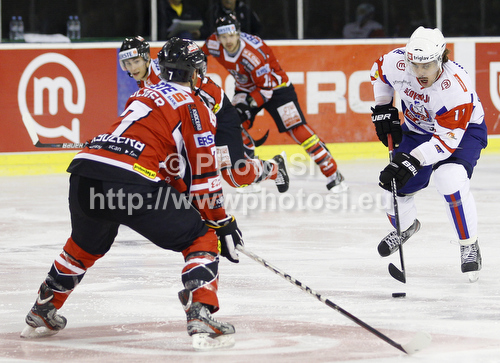 : Anze Kopitar (no.11) of Slovenia (R) trying to get around Stefan Ulmer (no.7) of Austria (L) during match of EIHC Ice hockey tournament between Slovenia and Austria. Match between Slovenia and Austria was held in Ljubljana Hala Tivoli arena, Slovenia, on Saturday, 10th of November 2012.