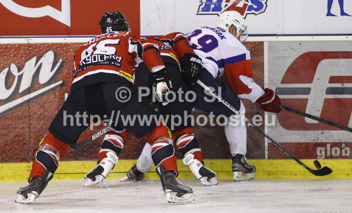 : David Schuler (no.45) of Austria (L) and Robert Lukas (no.55) of Austria (M) trying to stop Jan Mursak (no.39) of Slovenia (R) during match of EIHC Ice hockey tournament between Slovenia and Austria. Match between Slovenia and Austria was held in Ljubljana Hala Tivoli arena, Slovenia, on Saturday, 10th of November 2012.