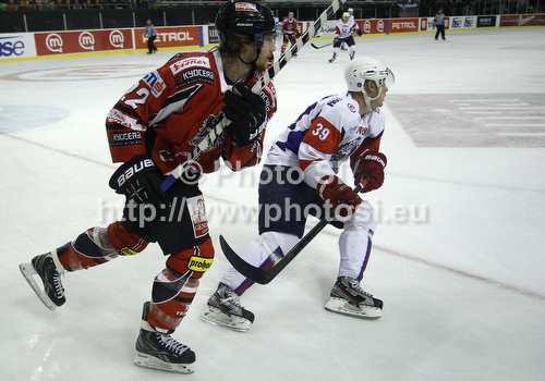 : Andreas Wiedergut (no.22) of Austria (L) and Jan Mursak (no.39) of Slovenia (R) during match of EIHC Ice hockey tournament between Slovenia and Austria. Match between Slovenia and Austria was held in Ljubljana Hala Tivoli arena, Slovenia, on Saturday, 10th of November 2012.