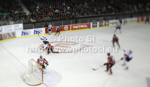 : Players in front of Austrian goalie, Bernhard Starkbaum (no.29) during match of EIHC Ice hockey tournament between Slovenia and Austria. Match between Slovenia and Austria was held in Ljubljana Hala Tivoli arena, Slovenia, on Saturday, 10th of November 2012.