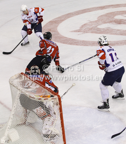 : Jan Mursak (no.39) of Slovenia (L) and Anze Kopitar (no.11) of Slovenia (R) in front of goalie Bernhard Starkbaum (no.29) of Austria during match of EIHC Ice hockey tournament between Slovenia and Austria. Match between Slovenia and Austria was held in Ljubljana Hala Tivoli arena, Slovenia, on Saturday, 10th of November 2012.