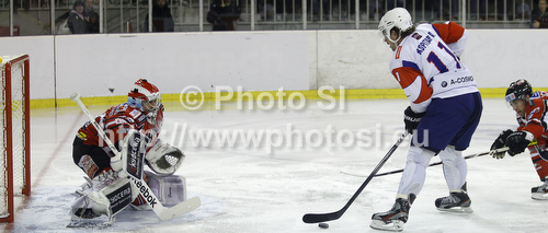 : Anze Kopitar (no.11) of Slovenia (R) in front of goalie Bernhard Starkbaum (no.29) of Austria (L) during match of EIHC Ice hockey tournament between Slovenia and Austria. Match between Slovenia and Austria was held in Ljubljana Hala Tivoli arena, Slovenia, on Saturday, 10th of November 2012.