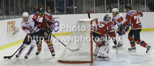 : Jan Mursak (no.39) of Slovenia (L) and Matthias Trattnig (no.51) of Austria (R) during match of EIHC Ice hockey tournament between Slovenia and Austria. Match between Slovenia and Austria was held in Ljubljana Hala Tivoli arena, Slovenia, on Saturday, 10th of November 2012.