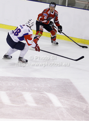 : David Schuler (no.45) of Austria (R) and Jan Urbas (no.28) of Slovenia during match of EIHC Ice hockey tournament between Slovenia and Austria. Match between Slovenia and Austria was held in Ljubljana Hala Tivoli arena, Slovenia, on Saturday, 10th of November 2012.