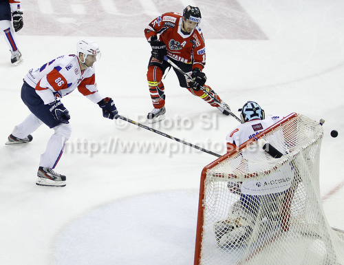 : Manuel Latusa (no.15) of Austria (M) shooting between Sabahudin Kovacevic (no.86) of Slovenia (L) while goalie Andrej Hocevar (no.1) of Slovenia saves during match of EIHC Ice hockey tournament between Slovenia and Austria. Match between Slovenia and Austria was held in Ljubljana Hala Tivoli arena, Slovenia, on Saturday, 10th of November 2012.