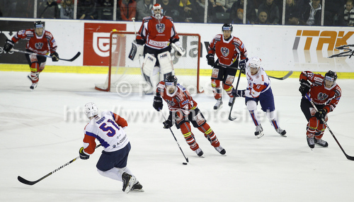 : Manuel Latusa (no.15) of Austria (M) leading Austrian team in offense during match of EIHC Ice hockey tournament between Slovenia and Austria. Match between Slovenia and Austria was held in Ljubljana Hala Tivoli arena, Slovenia, on Saturday, 10th of November 2012.
