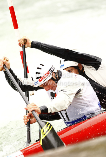 : Gauthier Klauss and Matthieu Peche of France during International ICF slalom Tacen 2010 white water kayaking race. International ICF slalom Tacen 2010 white water kayak race was held on Saturday, 15th of May 2010 in Tacen, Slovenia.
