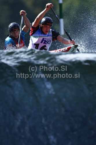 : Fourth placed Tomas Koplik and Jakub Vrzan of Czech during final run of men C-2 race of ICF Canoe Slalom World Championships 2010, which was held in Tacen, Slovenia, on Saturday, 11th of September 2010.