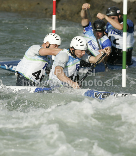 : Team of Great Britain during final run of men team C-2 race of ICF Canoe Slalom World Championships 2010, which was held in Tacen, Slovenia, on Saturday, 11th of September 2010.