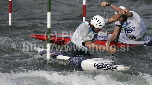 : Team of Great Britian with David Florence, Mark Proctor and Greg Pitt during final run of men C-1 team race of ICF Canoe Slalom World Championships 2010, which was held in Tacen, Slovenia, on Sunday, 12th of September 2010.