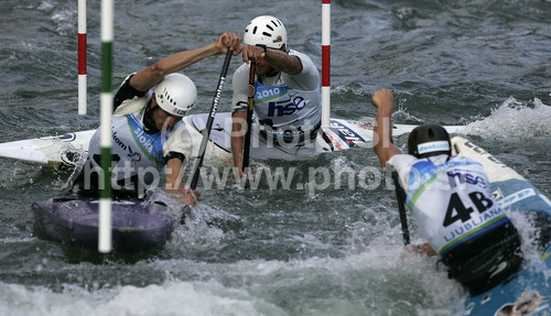 : Third placed Team of Czech with Stanislav Jezek, Jan Masek and Michal Jane during final run of men C-1 team race of ICF Canoe Slalom World Championships 2010, which was held in Tacen, Slovenia, on Sunday, 12th of September 2010.