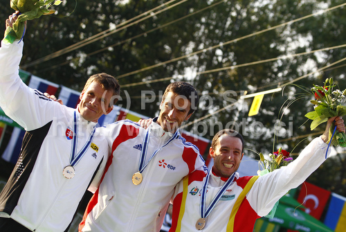 Tacen ,Slovenia - 12.09.2010 : Winner Tony Estanguet of France (M), second placed Michal Martikan of Slovakia (L) and third placed Jordi Domenjo of Spain (R) celebrate their medals won in men C-1 race of ICF Canoe Slalom World Championships 2010, which was held in Tacen, Slovenia, on Sunday, 12th of September 2010. Photo by: Primoz Jeroncic