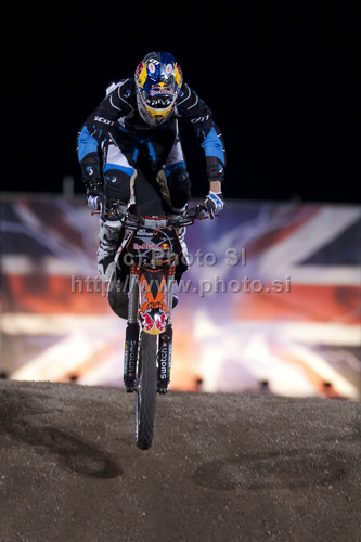 : Mat Rebeaud (USA) in action during a training session for the London stage of The Red Bull X-Fighters freestlye Motorcycle Cross Tournament held at Battersea Power Station in London, England, on 12th of August 2010.