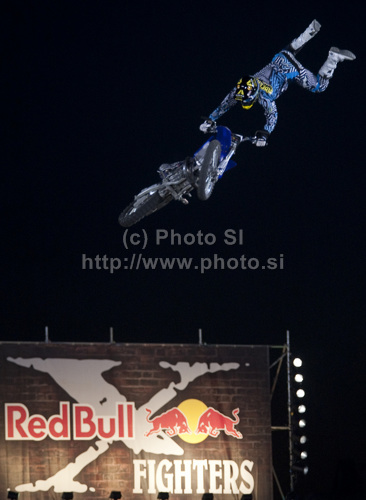 : Robert Adelberg (AUS) in action during a training session for the London stage of The Red Bull X-Fighters freestlye Motorcycle Cross Tournament held at Battersea Power Station in London, England, on 12th of August 2010.
