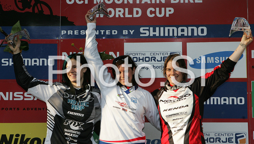 : Winner Anneke Beerten of Netherland (M), second placed Anita Molcik of Austria (L) and third placed Fionn Griffiths of Great Britain (R) celebrating their medals won in 4x MTB World Cup finals in Maribor, Slovenia. First race of UCI Nissan Mountain Bike World Cup 2008 was held in Maribor, Slovenia, on 10th of May 2008.