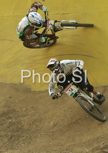 : Johannes Fischbach of Germany followed by Romain Saladini of France during 4x MTB World Cup finals in Maribor, Slovenia. First race of UCI Nissan Mountain Bike World Cup 2008 was held in Maribor, Slovenia, on 10th of May 2008.
