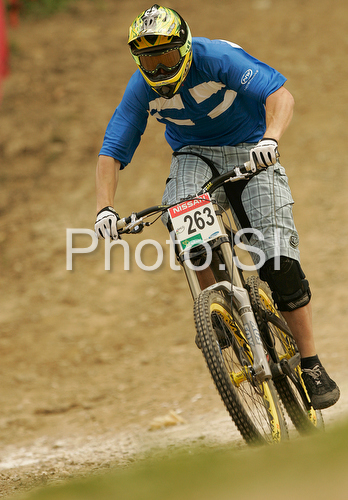 : Aki Farm of Finland during men final run of first Downhill MTB World Cup 2008. First men race of UCI Nissan Mountain Bike World Cup 2008 was held in Maribor, Slovenia, on 11th of May 2008.