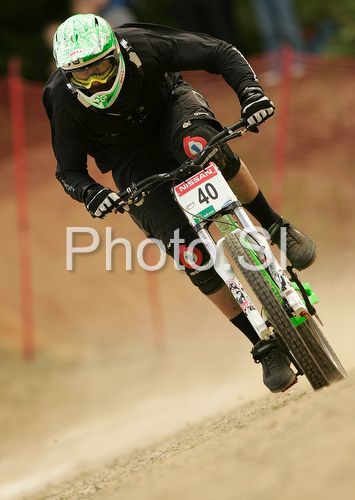 : Cedric Gracia of France during men final run of first Downhill MTB World Cup 2008. First men race of UCI Nissan Mountain Bike World Cup 2008 was held in Maribor, Slovenia, on 11th of May 2008.